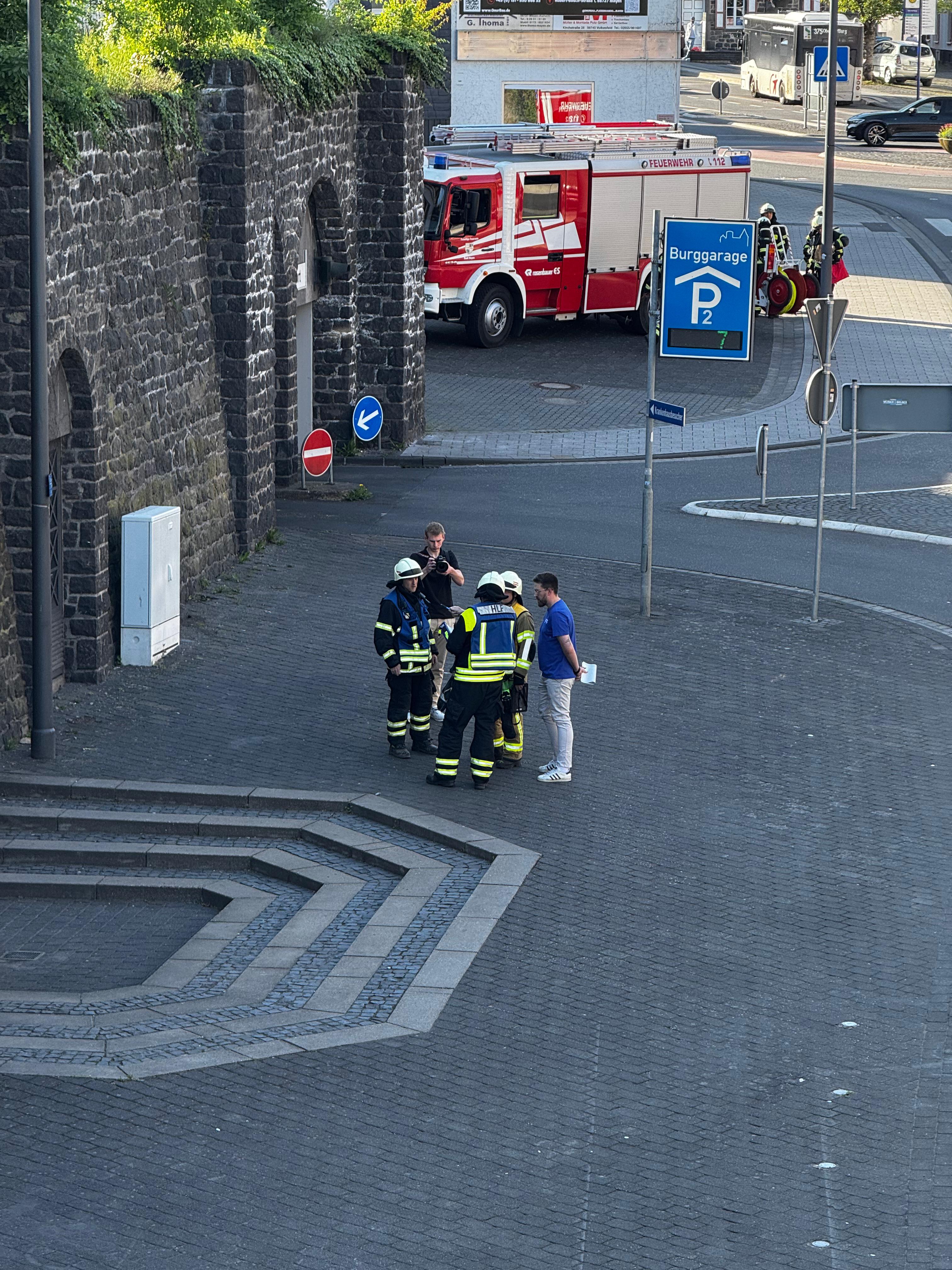 Mayen, 16. Mai 2025 – Dichte Rauchschwaden drangen am Abend aus der obersten Etage der Burggarage an der Genovevaburg – Grund zur Sorge bestand jedoch nicht: Es handelte sich um eine angelegte Übung der Freiwilligen Feuerwehr Mayen.